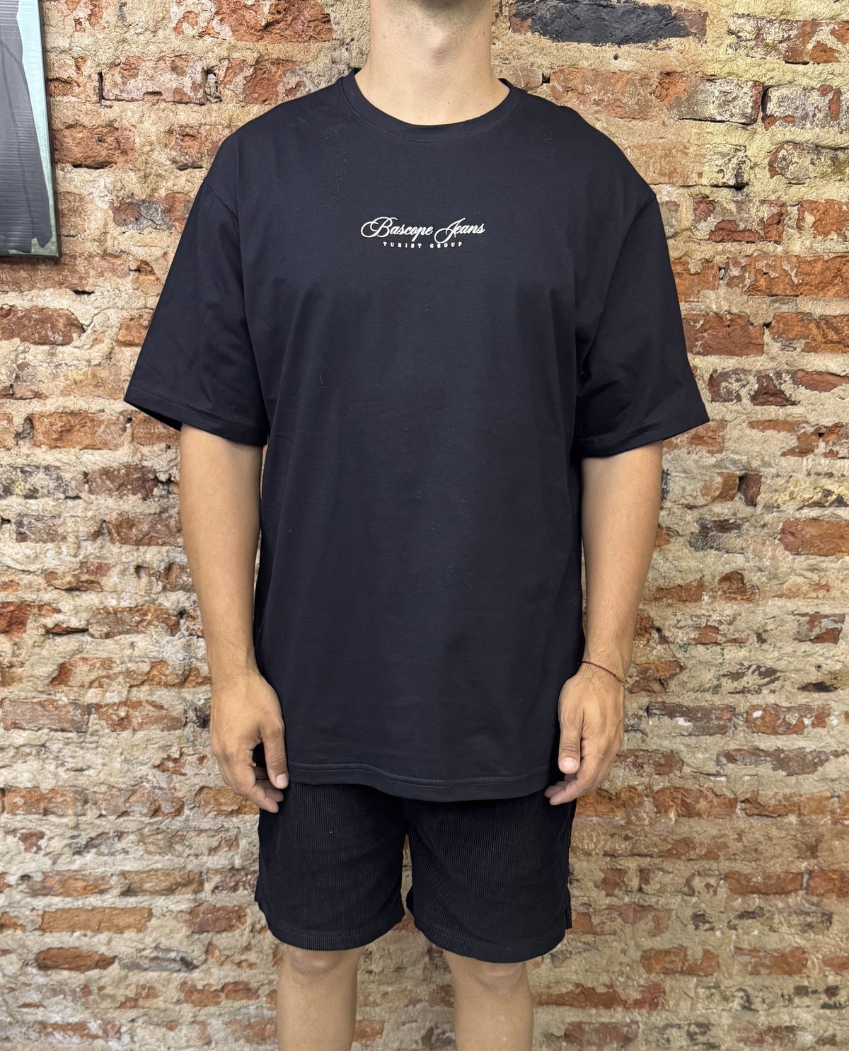 El modelo usa Talle L (distinto diseño de remera  pero mismo corte) y mide 1.80mts
